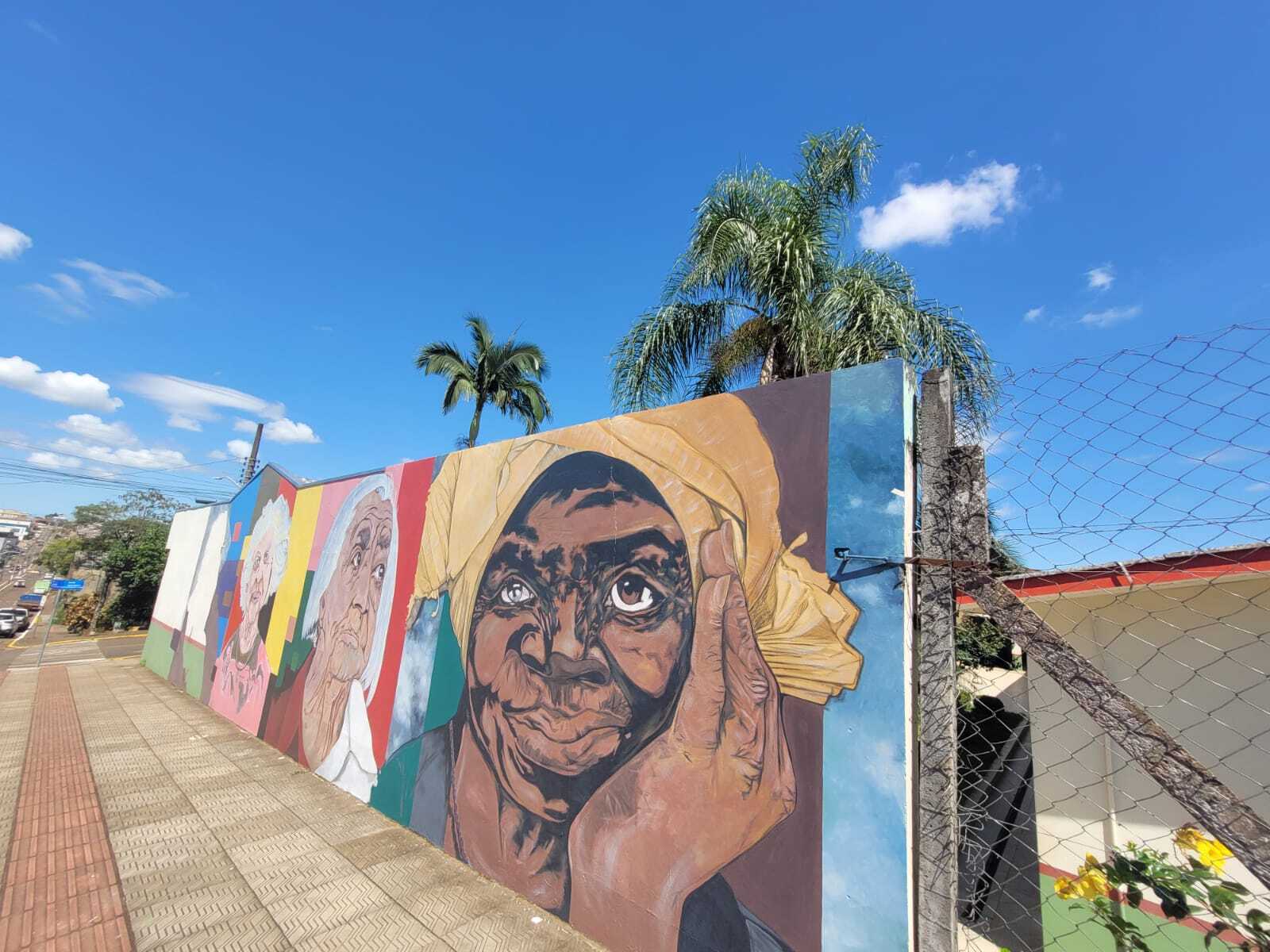 E feito mãe preocupada, transforma-se em vida naquele muro que era só cinza e que o artista Neori Jorge Reolon organizou. Tem mulheres desenhadas nele, representadas na diversidade, com a mão encostada no rosto, pensativa e observante. Tem a senhora do tempo, a experiência viva onde o branco está apenas no cabelo. Tem a que talvez não enxergue o mundo com os olhos, mas deve conhecer profundamente a jornada que todos e todas passamos. Tem também a que não está terminada, eu acho, não sei, o artista tem essa característica de nos colocar na periferia para mirar com maior reparo o que está sendo dito nas linhas configuradas pelo desenho. Só sei que vi mulheres ali e para mim, elas são as guardiãs da escola e estão por toda parte tentando sobreviver junto aos seus companheiros, com os baixos salários e tudo mais.