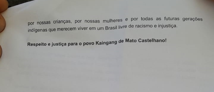 Também, destacaram que foram enviados documentos ao Ministério Público Federal, à Comissão de Direitos Humanos do Estado do Rio Grande do Sul e ao Conselho Estadual dos Povos Indígenas do RS. Ainda, as lideranças cobram que o governo federal agilize a demarcação da Terra Indígena Mato Castelhano, procedimento administrativo que permanece sem movimentação por parte do Executivo, alertando que a demora na garantia dos direitos territoriais perpetua a vulnerabilidade e o desrespeito aos povos indígenas.