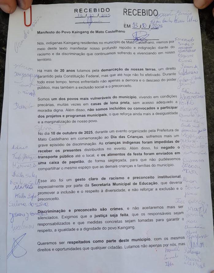As lideranças Kaingang da Terra Indígena Mato Castelhano, composta por quatro comunidades e cerca de 130 famílias, manifestaram profunda indignação e revolta diante do ato racista ocorrido. Destacam que as comunidades Kaingang estão mobilizadas, exigindo justiça, reparação e a responsabilização dos agentes que cometeram este crime contra as crianças e todas as comunidades. Conforme relatado, ao final da mobilização as lideranças Kaingang protocolaram um documento junto à Prefeitura Municipal e Brigada Militar reivindicando respeito, o fim de práticas discriminatórias e a inclusão efetiva das famílias Kaingang nas programações públicas e no orçamento municipal.