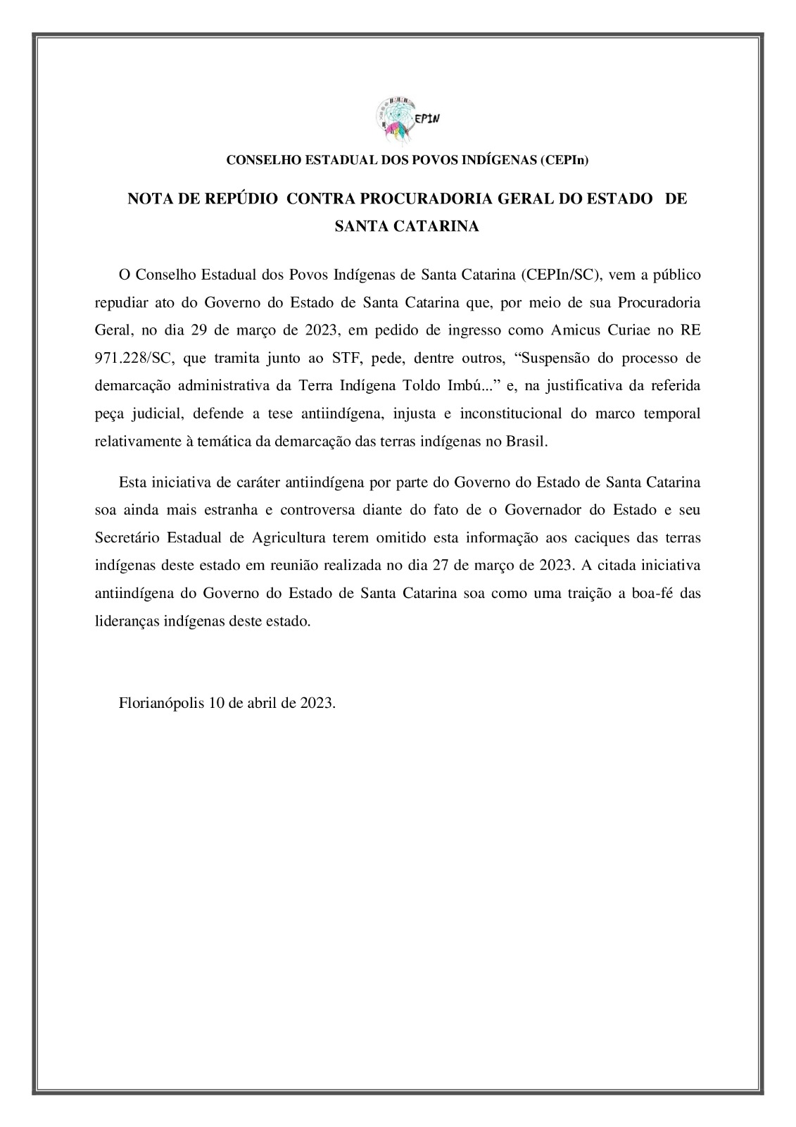 O Conselho Estadual dos Povos Indígenas (Cepin) também divulgou uma nota de repúdio contra a Procuradoria Geral da República: