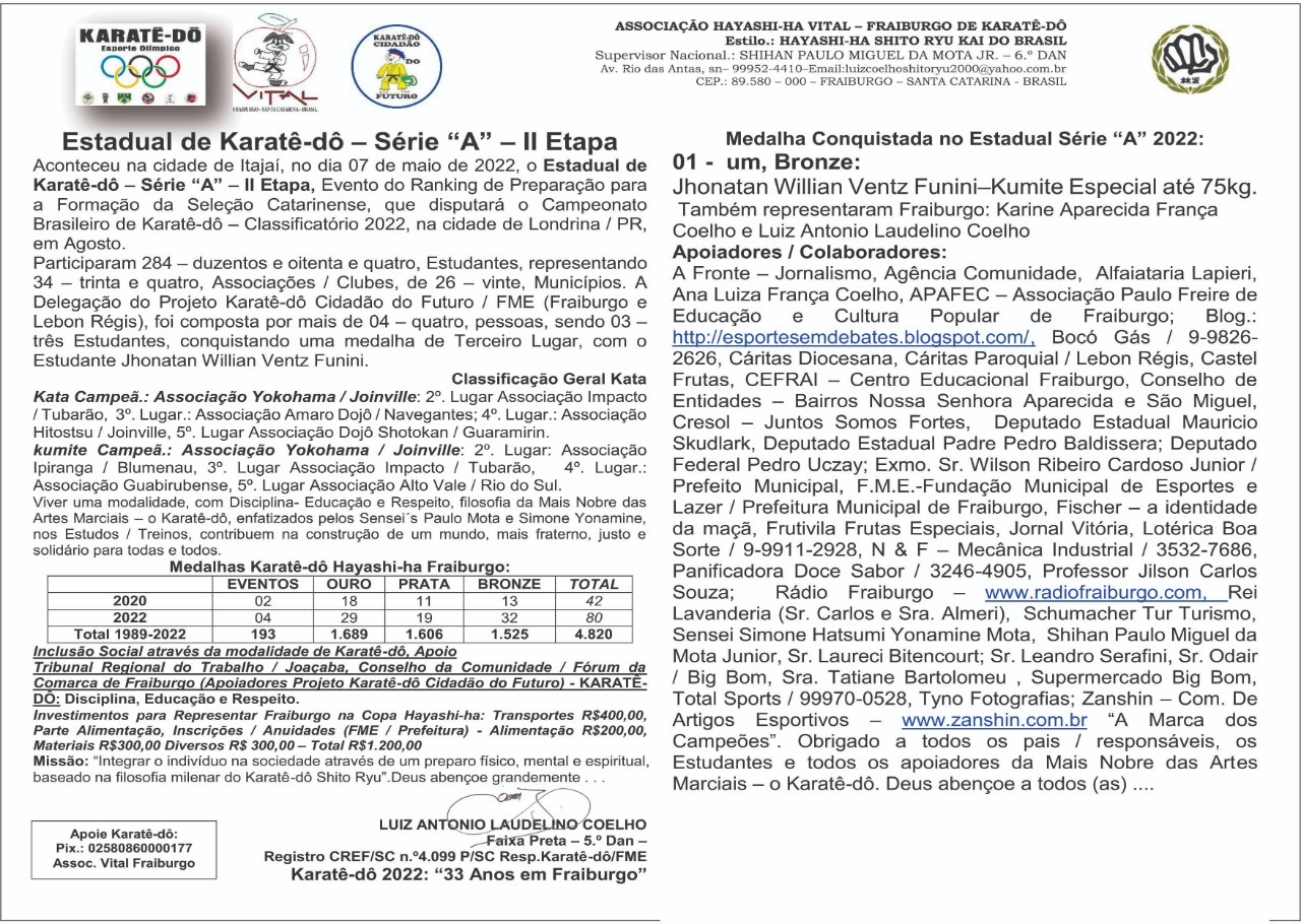 Aconteceu na cidade de Itajaí, no dia 07 de maio de 2022, o Estadual de Karatê-dô – Série “A” – II Etapa, evento do ranking de preparação para a formação da Seleção Catarinense, que disputará o Campeonato Brasileiro de Karatê-dô – Classificatório 2022, na cidade de Londrina / PR, em Agosto.