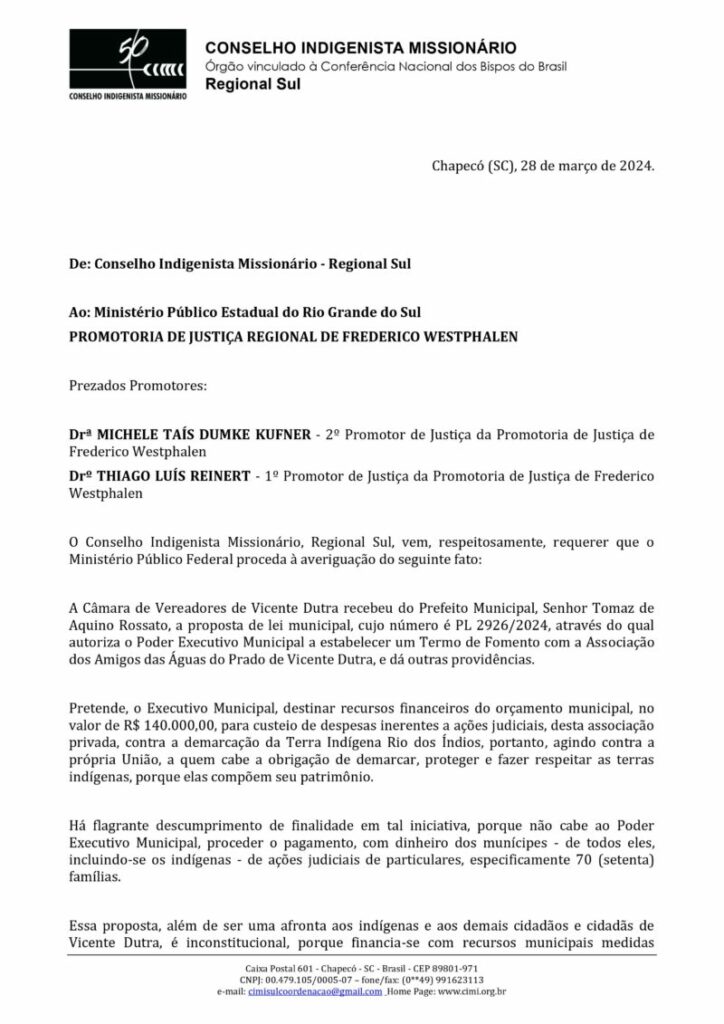 Nas imagens, denúncia do CIMI SUL ao Ministério Público Estadual: