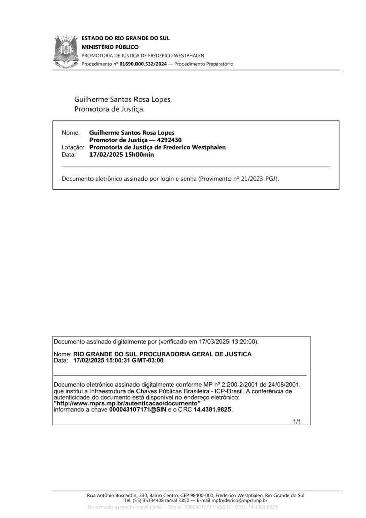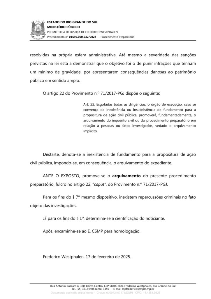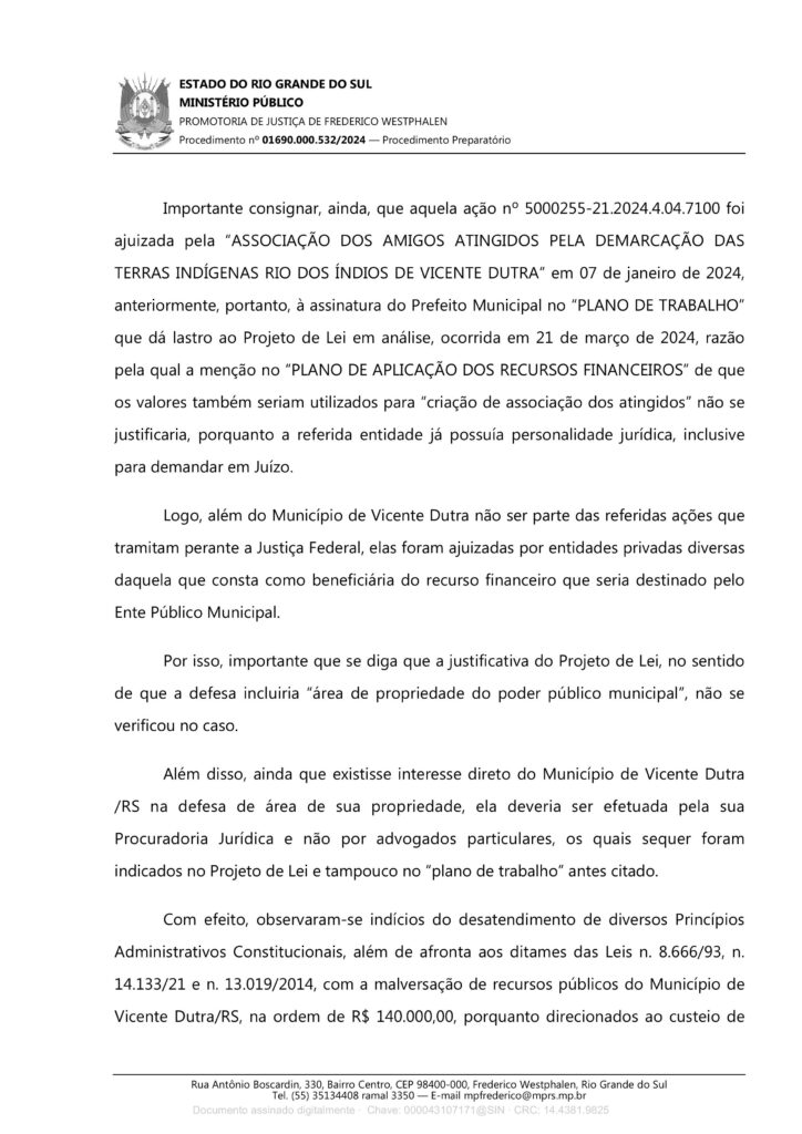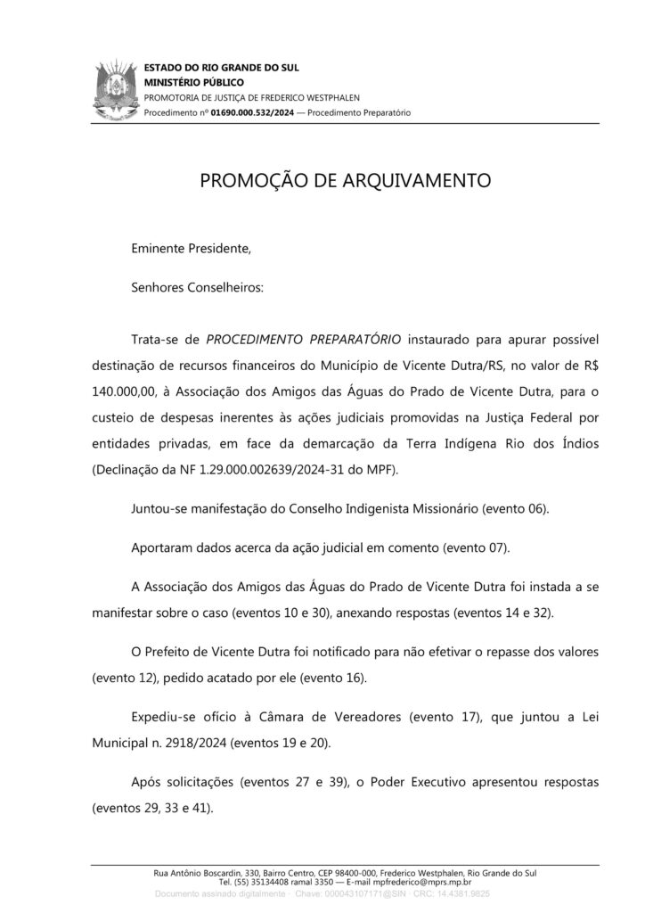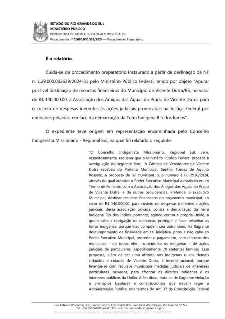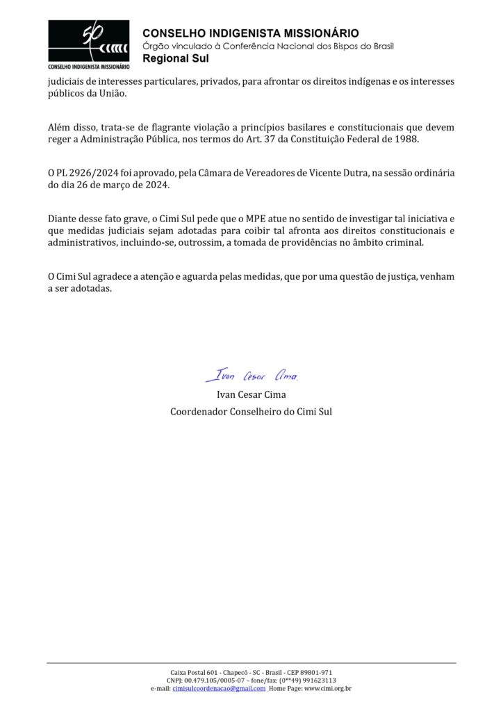 A partir da denúncia do CIMI SUL, Drª Irene destaca que, em 17 de fevereiro de 2025, o Ministério Público Estadual arquivou o inquérito que havia sido instaurado para investigar esse projeto de lei, aprovado pela câmara de vereadores de Vicente Dutra.