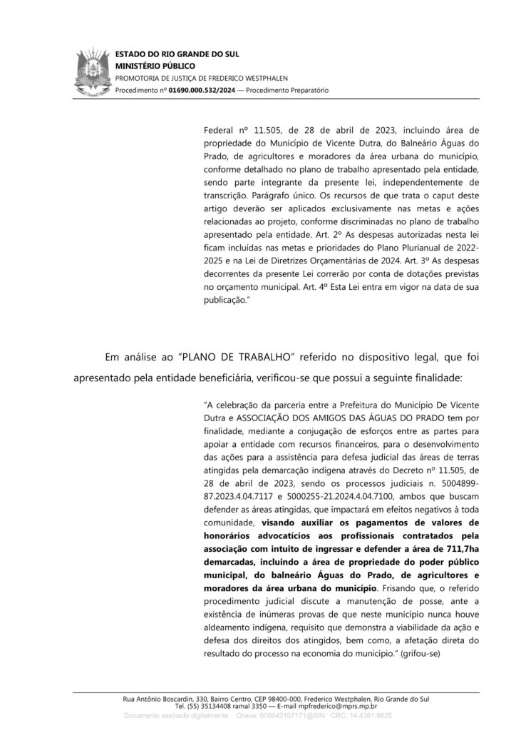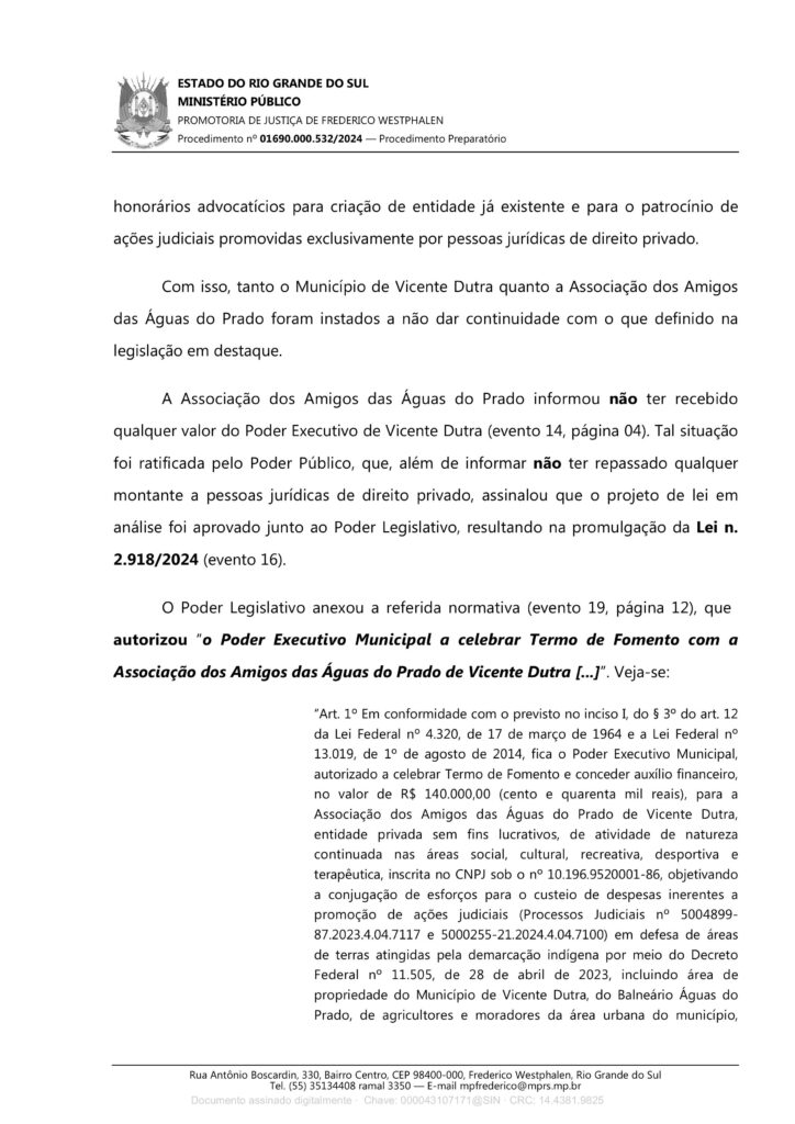 “Ao ser notificada para prestar esclarecimentos, tanto a Prefeitura de Vicente Dutra quanto a Associação dos Amigos das Águas do Prado, informaram que não chegou a ser feito repasse de verbas, tendo em vista que o Ministério Público havia determinado a imediata suspensão de qualquer movimentação financeira nesse sentido. Com o inquérito instaurado e as irregularidades apontadas, a legislação municipal foi revogada”.