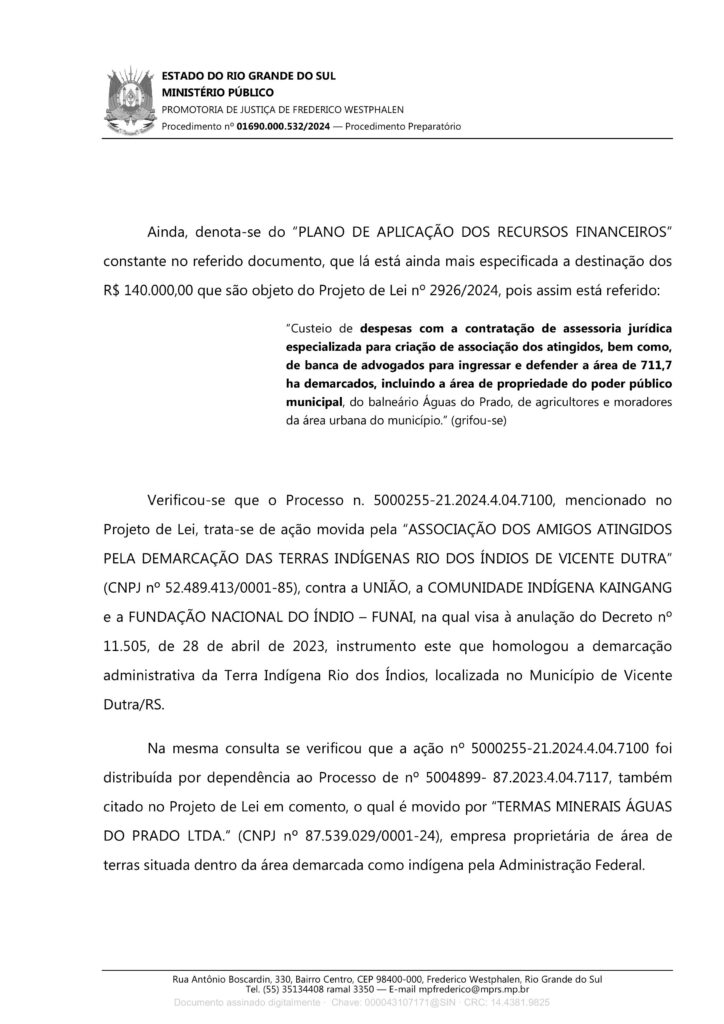“O objetivo foi de viabilizar, por meio dessa Lei, que foi aprovada na Câmara Municipal, que fossem destinados recursos financeiros do orçamento municipal, do conjunto dos munícipes, que inclui os indígenas, para custear despesas das ações judiciais que visam anular o processo de demarcação. Diante disso, o CIMI tomou a iniciativa de apresentar uma denúncia/representação junto ao Ministério Público Federal, Ministério Público Estadual e Ministério Público de Contas para apontar os fortes indícios do mau uso do dinheiro público, afrontando os princípios da Administração Pública, porque o projeto de lei buscava financiar, com dinheiro público, medidas judiciais de interesses privados, que são os particulares ligados ao empreendimento Termas do Águas do Prado e que é parte interessada na anulação do processo de demarcação do território indígena”, contextualizou.