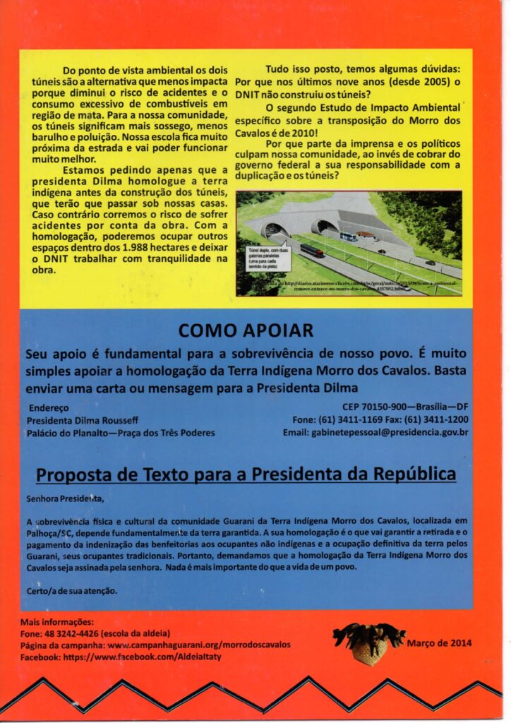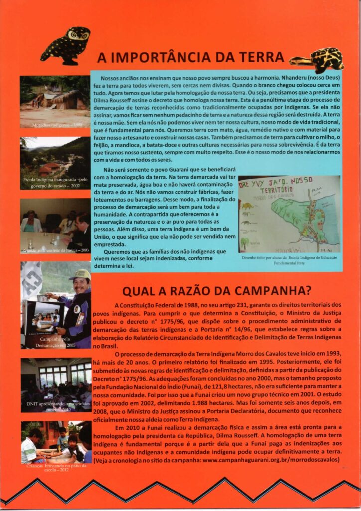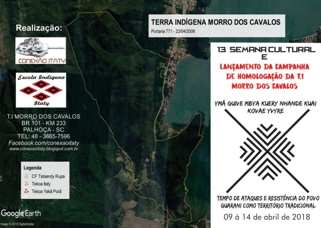 A história de luta no Morro dos Cavalos envolve, inclusive, campanhas feitas em prol da sua homologação. Entre elas, destacamos a pesquisa feita pela Comunidade Guarani Itaty/Terra Indígena Morro dos Cavalos, a partir do Cacique Teófilo Karaí, também Celestino Gonçalves e Antônio Carlos Antunes – Cacique e vice-cacique da TI Morro dos Cavalos no ano tal, além da Comissão Guarani Nhemonguetá, com Agostinho Moreira – Coordenador, do Conselho Estadual dos Povos Indígena, José Benites e membros do Conselho Indigenista Missionário, Osmarina de Oliveira e Clovis Brighenti, Comissão de Assuntos Indígenas/Associação Brasileira de Antropologia e Marque e LII/UFSC, Maria Dorothea Post Darella, com os seguintes detalhamentos: