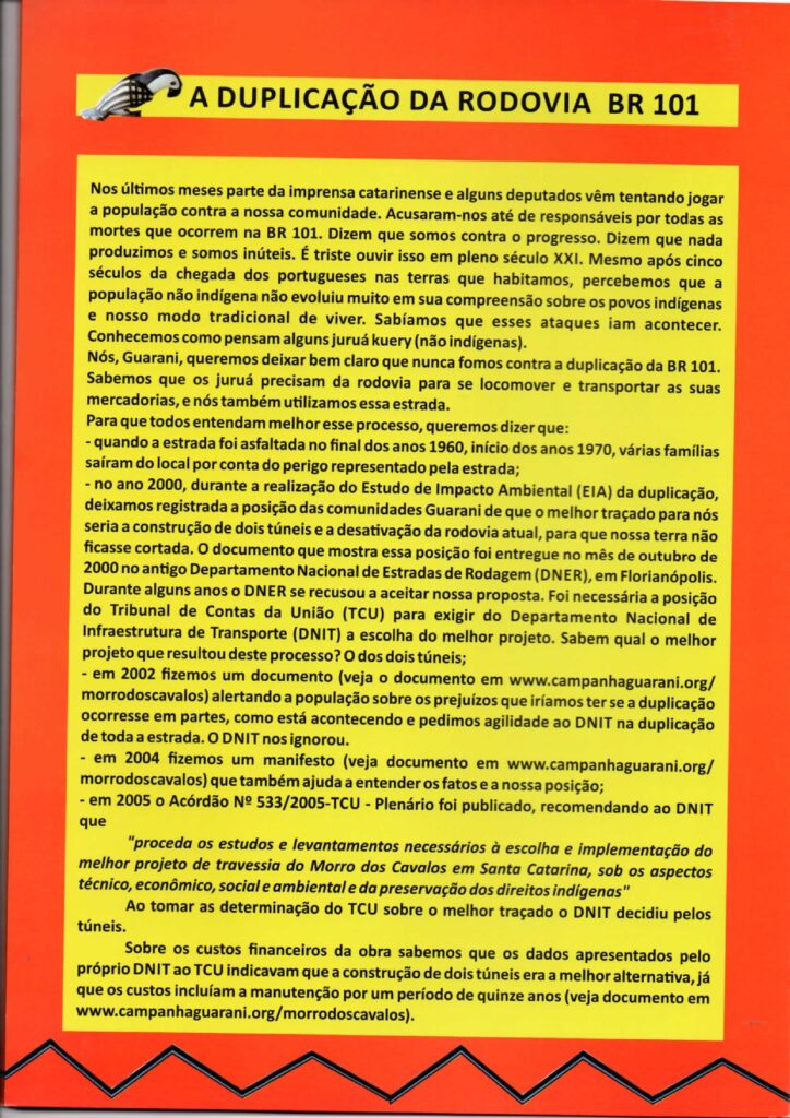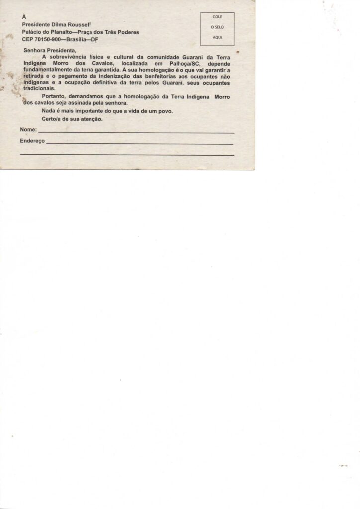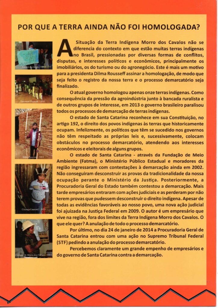 “Tanto no Toldo Imbu quanto no Morro dos Cavalos é importante destacar que ao longo de todo tempo de luta dessas comunidades pela conquista do território, vivenciaram violências diversas, desde a expulsão de seu território, preconceito, negação dos direitos e procuraram, ao longo da luta, diferentes estratégias para reconquistar seu espaço, seja nas retomadas ou em mobilizações em órgãos públicos. Mesmo em um estado como o de Santa Catarina, muito preconceituoso com os povos indígenas, os Kaingang e Guarani não desistiram e seguiram persistentes, fazendo pressão para que a Funai constituísse o Grupos de Trabalho para realização dos estudos de identificação e delimitação do território, para que o Ministério da Justiça publicasse as portarias declaratórias das terras Kaingang e Guarani e, nos últimos tempos, para que o Governo Federal efetivamente, por meio da homologação, desse outro passo essencial na garantia desse direito fundamental, que é a reconquista do território”.