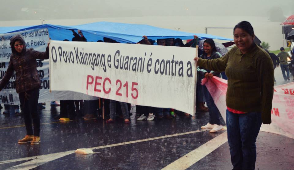 Mobilização indígena contra PEC 215, na ponte que faz divisa entre os estados de Santa Catarina e Rio Grande do Sul, na SC-480, em novembro de 2015. Foto: Claudia Weinman.