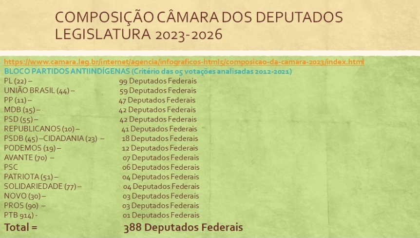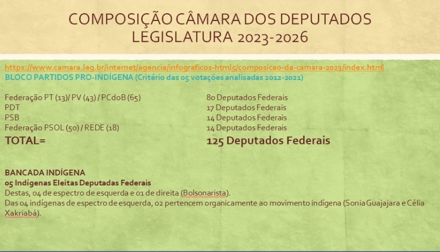 Já as/os deputados/as pró –indígenas eleitas/os somam 125, destes, cinco são indígenas, duas ligadas ao movimento indígena Sonia Guajajara (PSOL – SP) e Célia Xakriabá (PSOL – MG). Duas candidaturas eleitas pelo Partido dos Trabalhadores: Juliana Cardoso (PT – SP) e Paulo Guedes (PT -MG) e uma bolsonarista: Silvia Waiãpi (PL -AP).