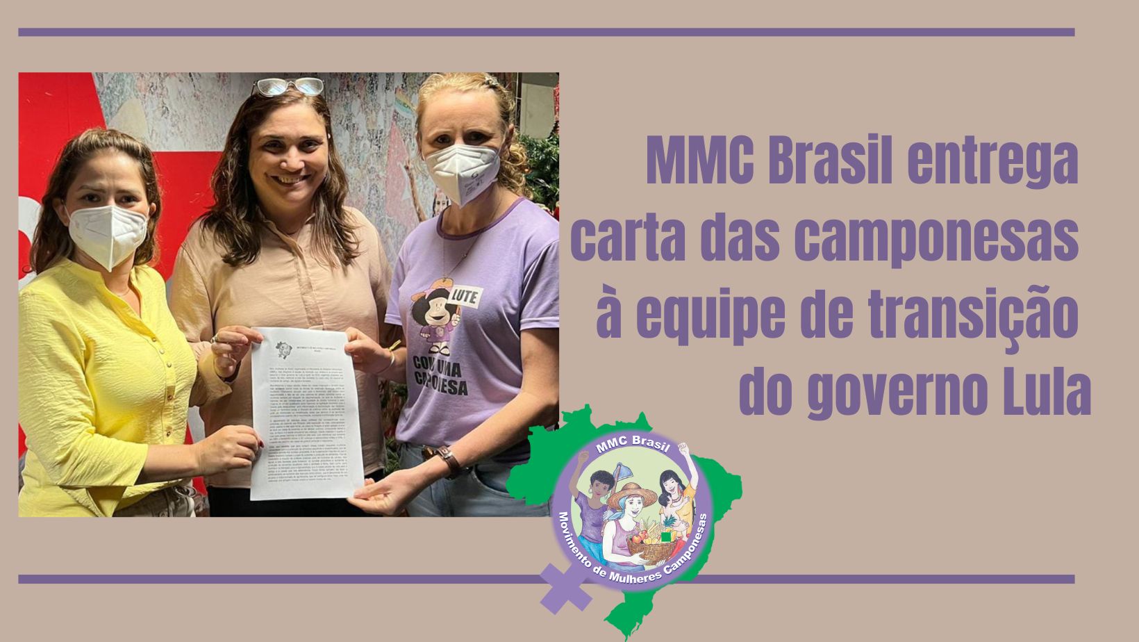 No dia 30 de novembro, o Movimento de Mulheres Camponesas realizou a entrega “à companheira Misiara Oliveira, da Executiva Nacional do PT e integrante do GT de Mulheres da equipe de transição para o governo Lula, uma carta com pautas, preocupações e propostas das camponesas”, conforme divulgado pelo movimento. O movimento segue em Brasília realizando articulações e diálogos nesse período de transição de governo e construção de propostas.