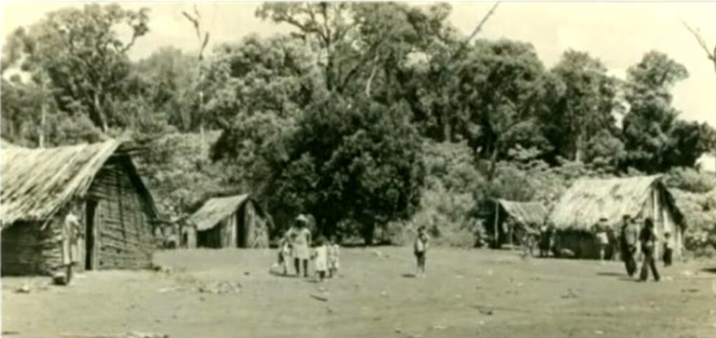 Centro da aldeia Ocoy/Jacutinga, 1979, nas margens do Rio Paraná. Imagem: Arquivo Cimi Sul.