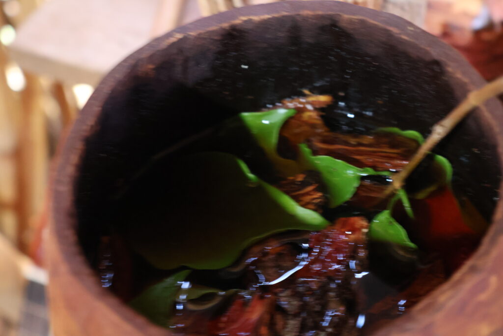 Outro elemento destacado pelo professor Clovis é a bebida de cauim, feita a base de milho moído, cozido com água, sem adição de açúcar ou sal, preparado na gamela de cedro, consumido, segundo ele, nos rituais, como parte sagrada dessa atividade feita a partir do conhecimento ancestral dos/as rezadores/as. Para o professor, a junção de todos esses elementos fortalece o vínculo dos guarani com as plantas, já que, conforme ele, esses povos carregam um vínculo estreito com a mata e a própria agricultura.