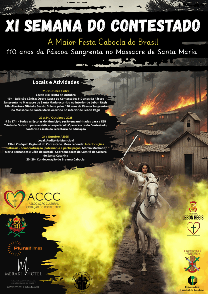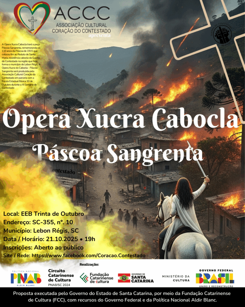 No dia 21 de outubro de 2025, no Ginásio de Esportes da EEB Trinta de Outubro, do Assentamento Rio dos Patos, em Lebon Régis, Coração do Contestado, no estado de Santa Catarina, acontecerá a exibição cênica: Ópera Xucra do Contestado: 110 anos da Páscoa Sangrenta no Massacre de Santa Maria ocorrido no interior de Lebon Régis, atividade que abre a XI Semana do Contestado, cuja abertura oficial e sessão solene pelos 110 anos da Páscoa Sangrenta no Massacre de Santa Maria, será realizada logo após a apresentação da Ópera Xucra do Contestado.