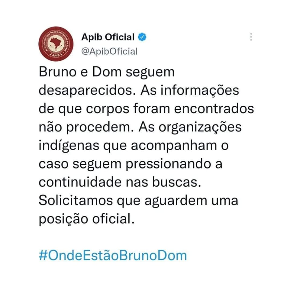 A Articulação dos Povos Indígenas do Brasil também reforça que, frente as notícias falsas divulgadas de que os corpos de Dom e Bruno teriam sido encontrados, o canal oficial sobre as buscar do indigenista e do jornalista podem ser acompanhadas acessando: https://univaja.info/. Siga nas redes Univaja (@univajaoficial), Coiab (@coiaboficial), OPI (@opi.isolados) e Apib (@apiboficial). Saiba o que está acontecendo e ajude a cobrar velocidade nas buscas por Bruno e Dom.